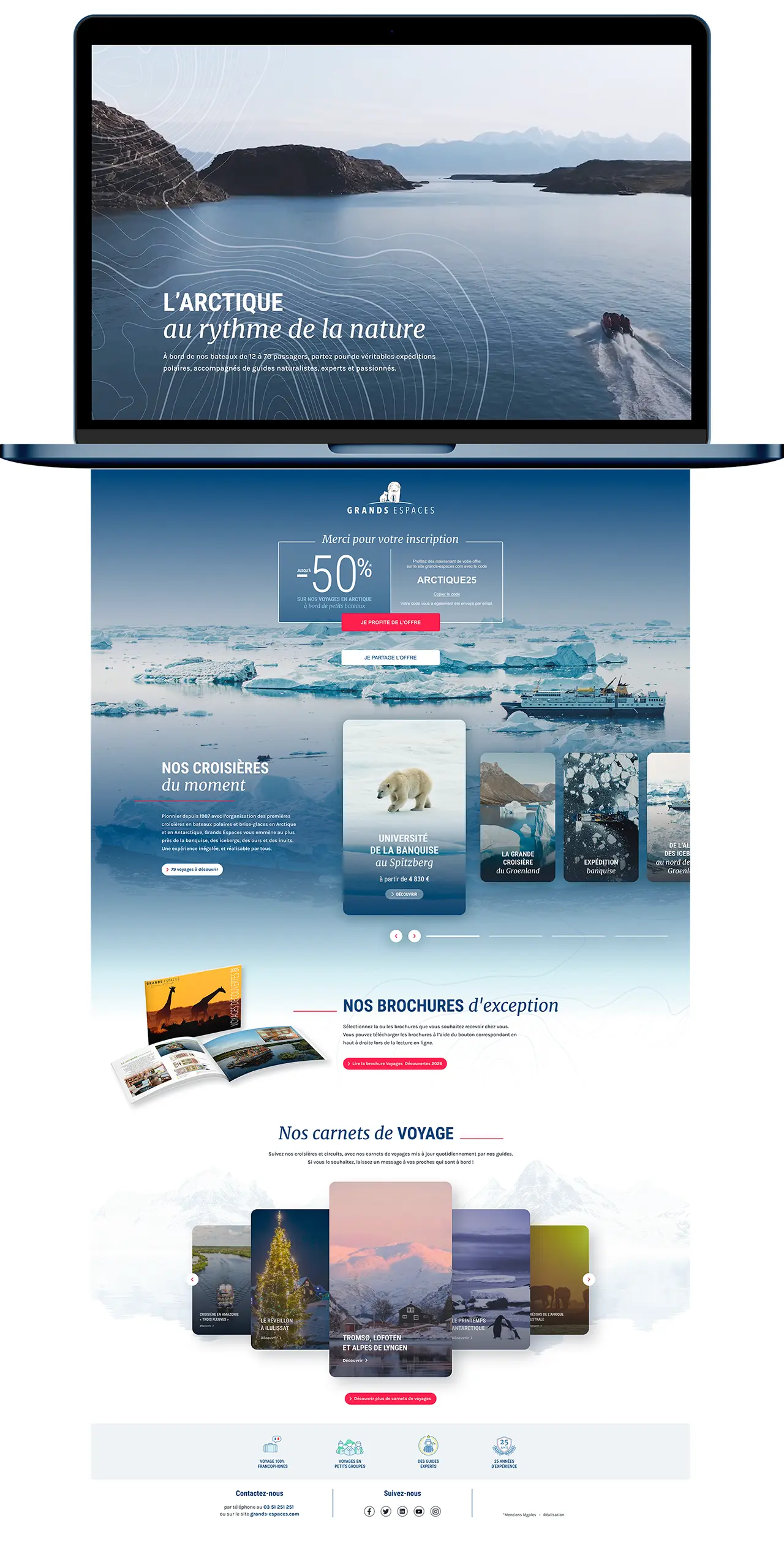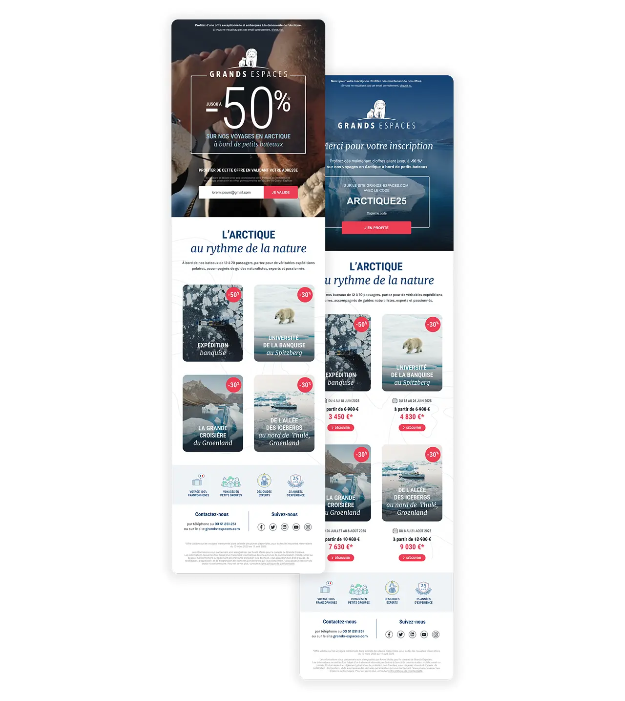 Nous avons orchestré une campagne d'acquisition multicanale associant e-mailings et mini-site dédié, construite autour du territoire "L'Arctique au rythme de la nature". L'univers graphique puise dans la majesté des paysages polaires : photographies époustouflantes d'icebergs et de faune arctique, palette chromatique glaciale rehaussée de touches corail dynamiques, et typographie contrastée qui évoque à la fois l'immensité et l'intimité de ces expéditions.